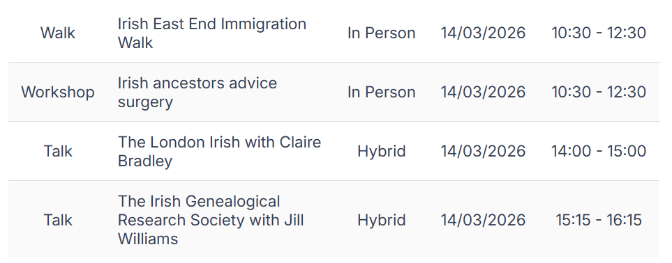 The Society of Genealogists is hosting a day on the topic of The London Irish. Parts are available online as well as in-person with Claire Bradley and Jill Williams.
